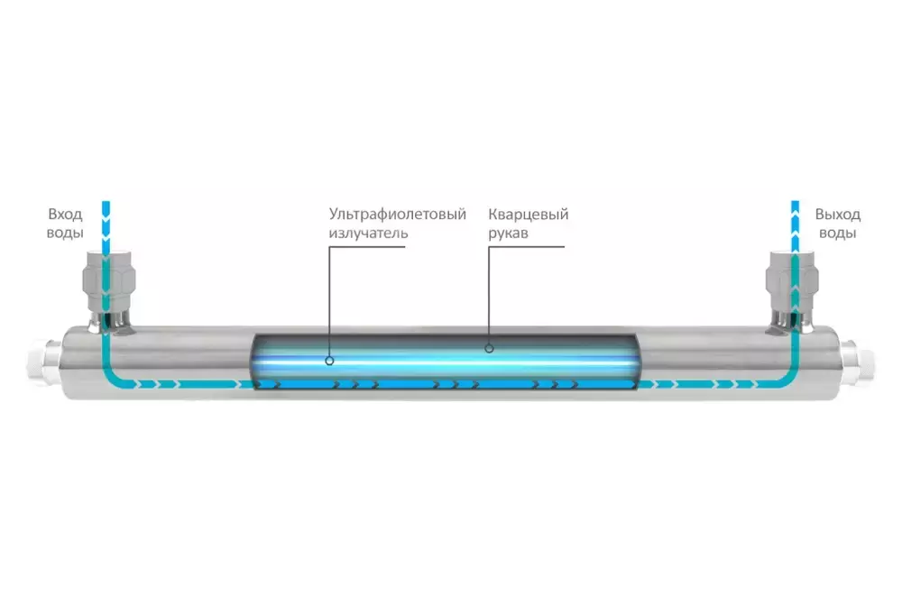 Вода подається в корпус ультрафіолетового знезаражувача, де власне і відбувається знезараження мікроорганізмів. Вхідний потік води омиває кварцевий чохол і отримує необхідну дозу ультрафіолетового опромінення.